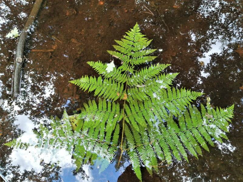 Door de regen van de afgelopen dagen staan er hier en daar plassen op de paden, waarin op een enkele plek een mooi groot blad van een varen ligt. Samen met de weerspiegeling van de lucht vond ik het een prachtig beeld om op de foto te zetten.