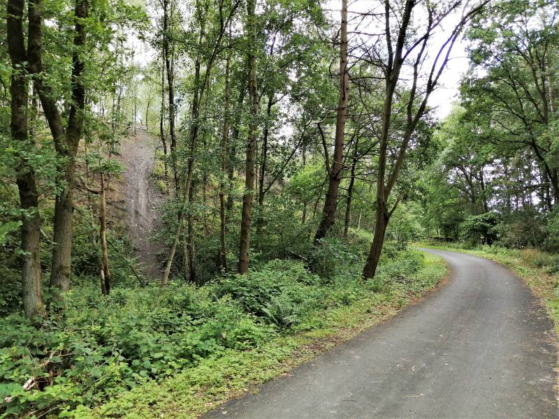 Op een gegeven moment kom je uit op een smalle asfaltweg (zie bij punt 6 van de routebeschrijving) en tussen de bomen door zie je links de grijze kleur van een afvalberg (terril).