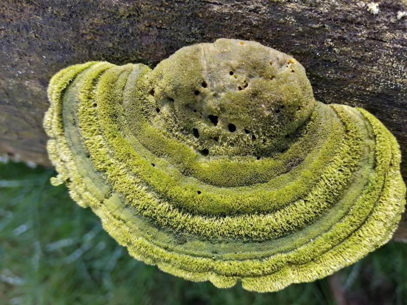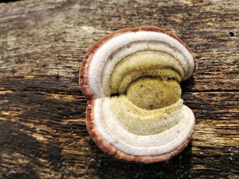 Langs de wildwissel liggen stukken boomstammen en boomstronken waarop diverse schimmels parasiteren.