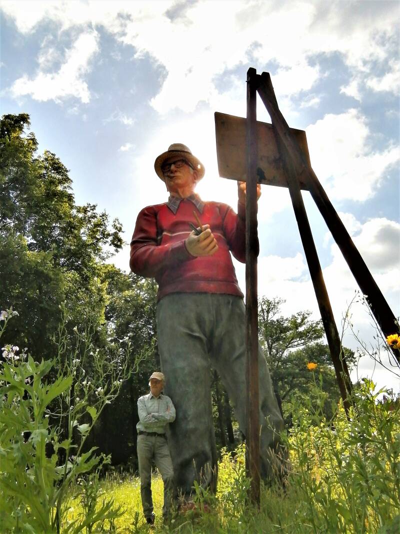 Iets verderop staat een enorm groot beeld van kunstenaar Andreas Schotel (1896-1984) die bij zijn schildersezel staat te schilderen in zijn directe werkomgeving.
