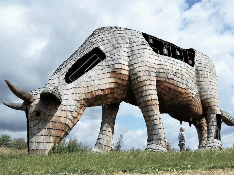 Je kunt zelfs binnenin de koe rondkijken wanneer je in de kop de stalen trap beklimt.