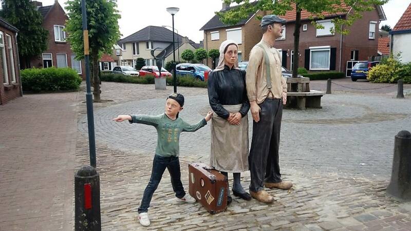 Na de koe gaat de wandeling verder over een veldweg waarlangs het Knikkend Wilgenroosje bloeit. De veldweg leid je naar de bebouwde kom van Esbeek. In het zicht van de voormalige St. Adrianuskerk zie je op de foto een kunstwerk “De Verbinding”, gemaakt door Hannes Verhoeven, langs de Dorpsstraat staan. Dit kunstwerk van wachtende reizigers verwijst naar de voormalige trambaan die tussen 1907 en 1909 was aangelegd om van Tilburg via Esbeek naar het Belgische Poppel en Turnhout te kunnen reizen. In 1937 is de tramdienst opgeheven. Het werk verwijst ook naar kunstenaar Andreas Schotel voor wie de tram zijn verbinding naar Rotterdam was.