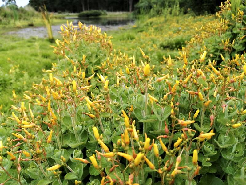 Op de natte oevers bij het ven groeit en bloeit het gele Moerashertshooi.