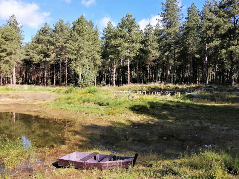Door bosgebied, langs een grote akker, over een brede zandweg en een begroeid bospad kom je langs een mooi bosven.