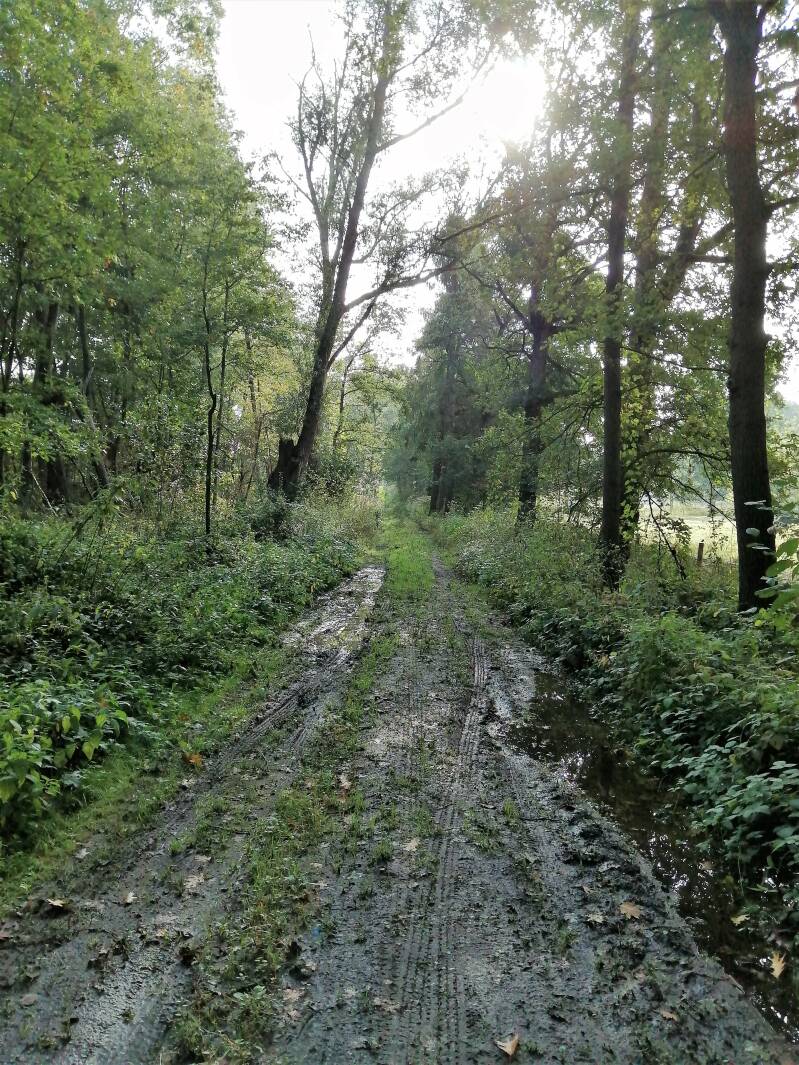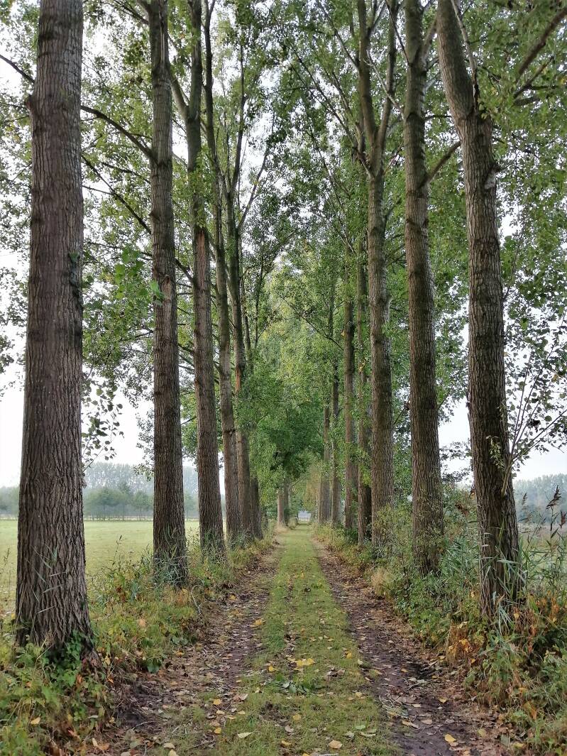 Tussen landbouwpercelen loop je over onverharde paden tussen rijen populieren door.