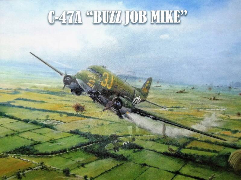 Een stuk verder langs het pad “De Schoonberg” (zie punt 8 van de routebeschrijving) staat een monument en een plaquette ter herinnering aan een neergestorte Dakota op 23 september 1944. Hier op de Schoonberg werd het door Duits afweergeschut neergehaald. Het Amerikaanse vliegtuig moest een zweefvliegtuig met troepen afleveren bij een luchtlandingszone in Overasselt-Grave. De afbeelding is van een schilderij gemaakt in 2004 tijdens de 60e herdenking in Groesbeek. De bijnaam van het toestel was “Buzz Job Mike”. De afbeelding laat zien dat enkele bemanningsleden uit het toestel springen en dat de glider is losgekoppeld.