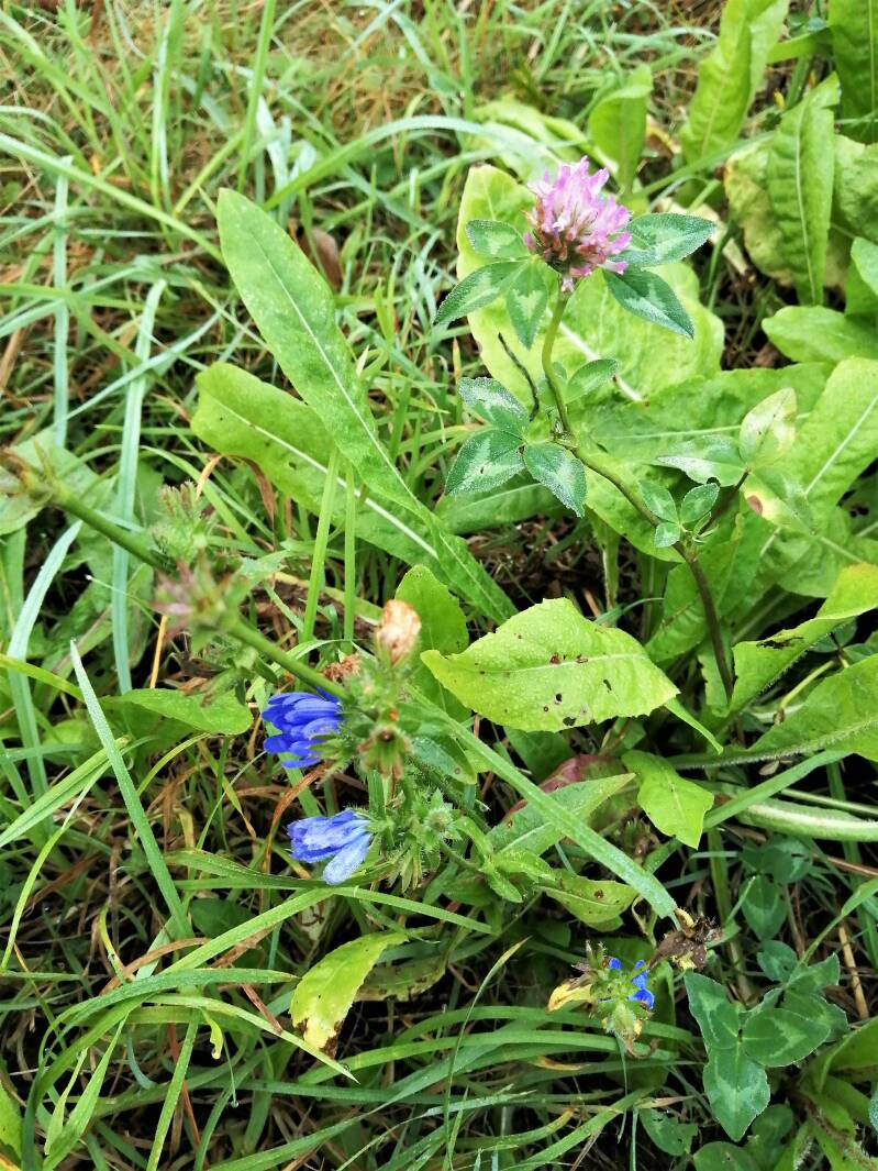 Naast een van de paden zag ik een Gentiaan met zijn blauwe kleur naast een bloeiende Aardbeiklaver.