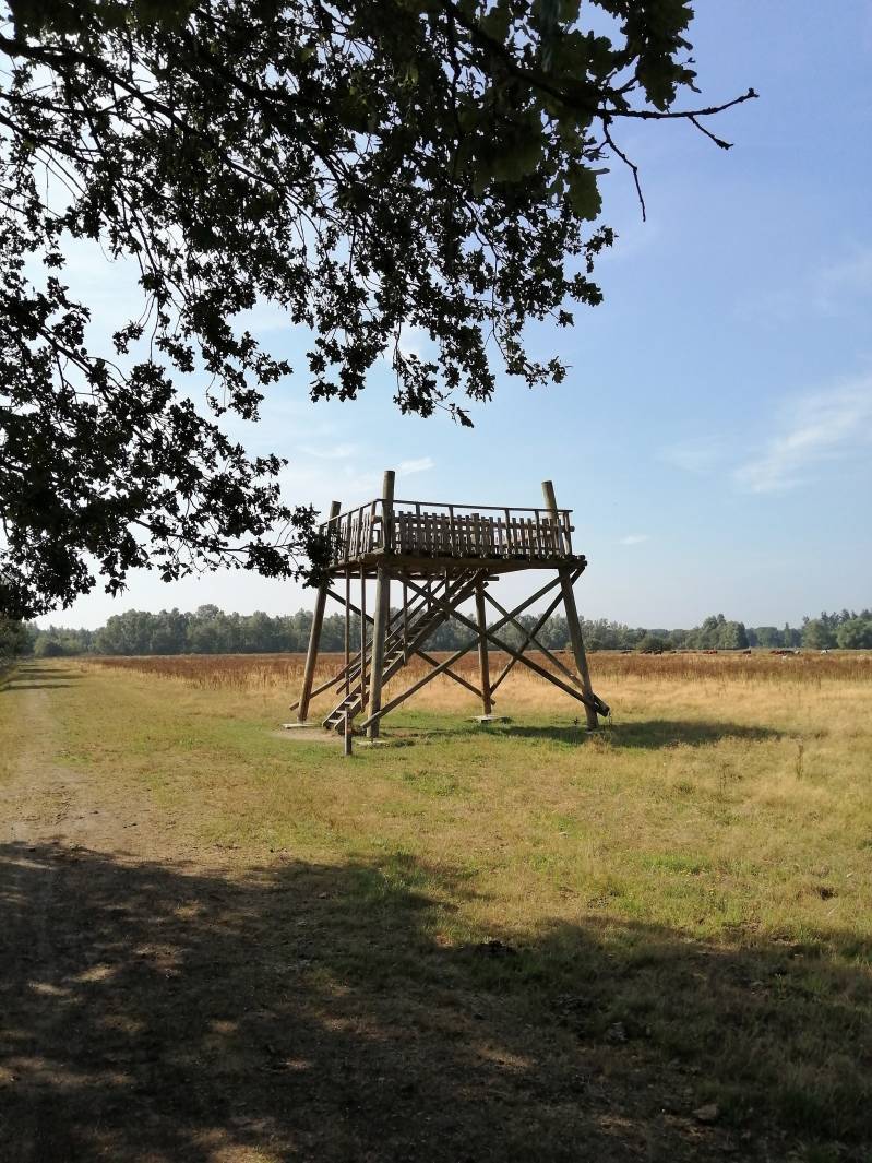 Lopend langs een open gebied kom je verderop langs een uitkijktoren. Boven op die toren kijk je uit op de omgeving waar aan de ene kant koeien grazen en aan de andere kant kijk je over een deel van het natuurgebied waar ook de heide in bloei staat. Die bloeiende heide zullen we onderweg nog veel zien.