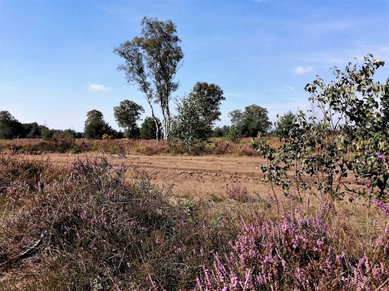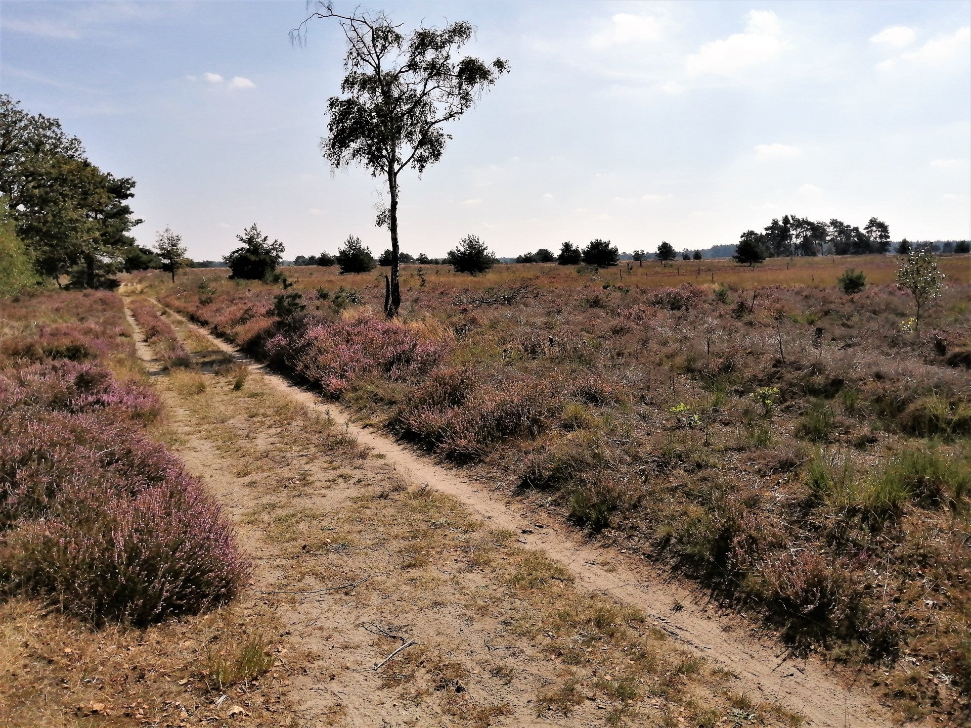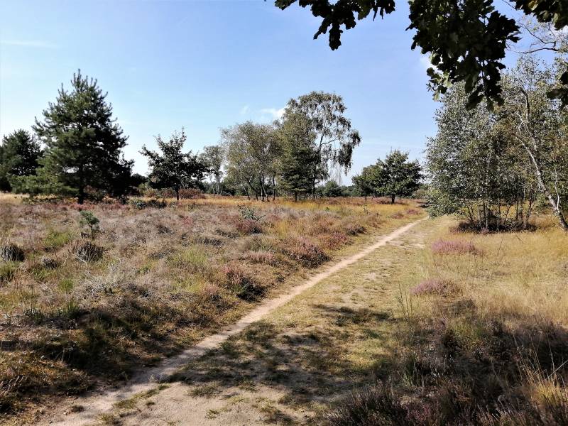De tocht gaat een tijdje over zandpaden langs het heidegebied waar je soms een jonge den ziet strijden voor zijn bestaan.