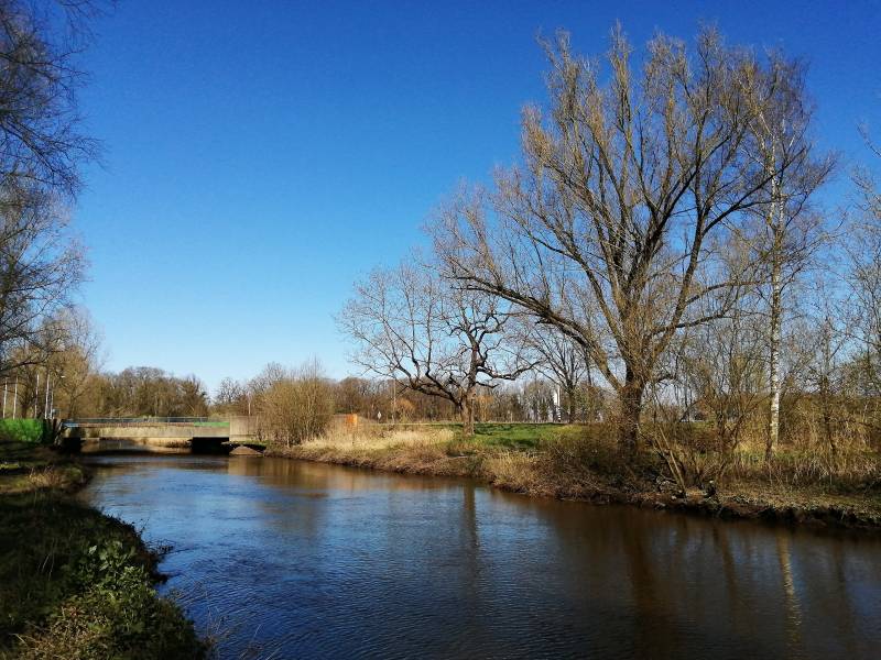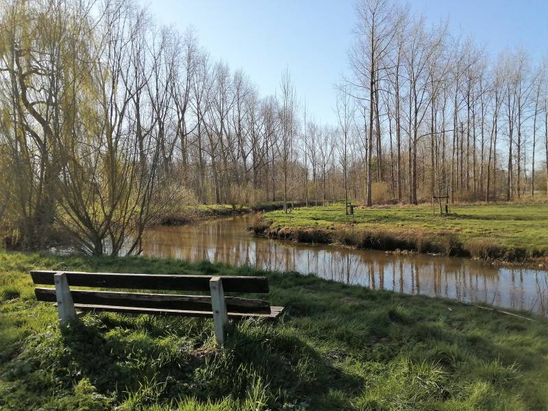 Voorbij het atletiekcentrum keert de route linksom en verplaatst zich naar de andere kant van de Kleine Dommel. Om een pauze te nemen kun je hier plaatsnemen op een van de banken naast de rivier (zie punt 6 van de routebeschrijving).