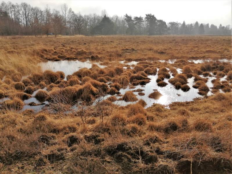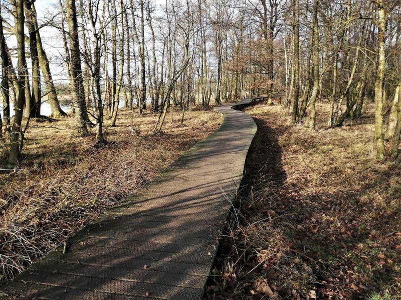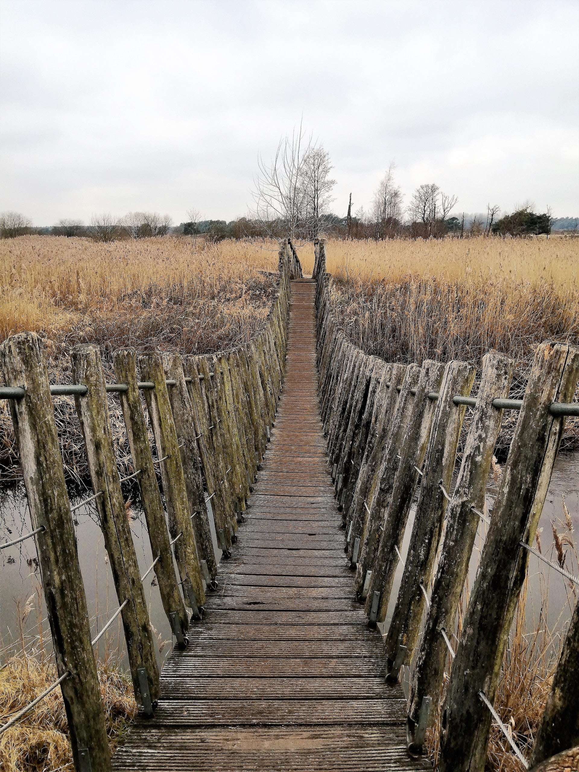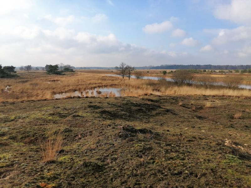 Over een knuppelbrug lopen we over Belgisch grondgebied door het mooie natuurgebied met diverse vennen.