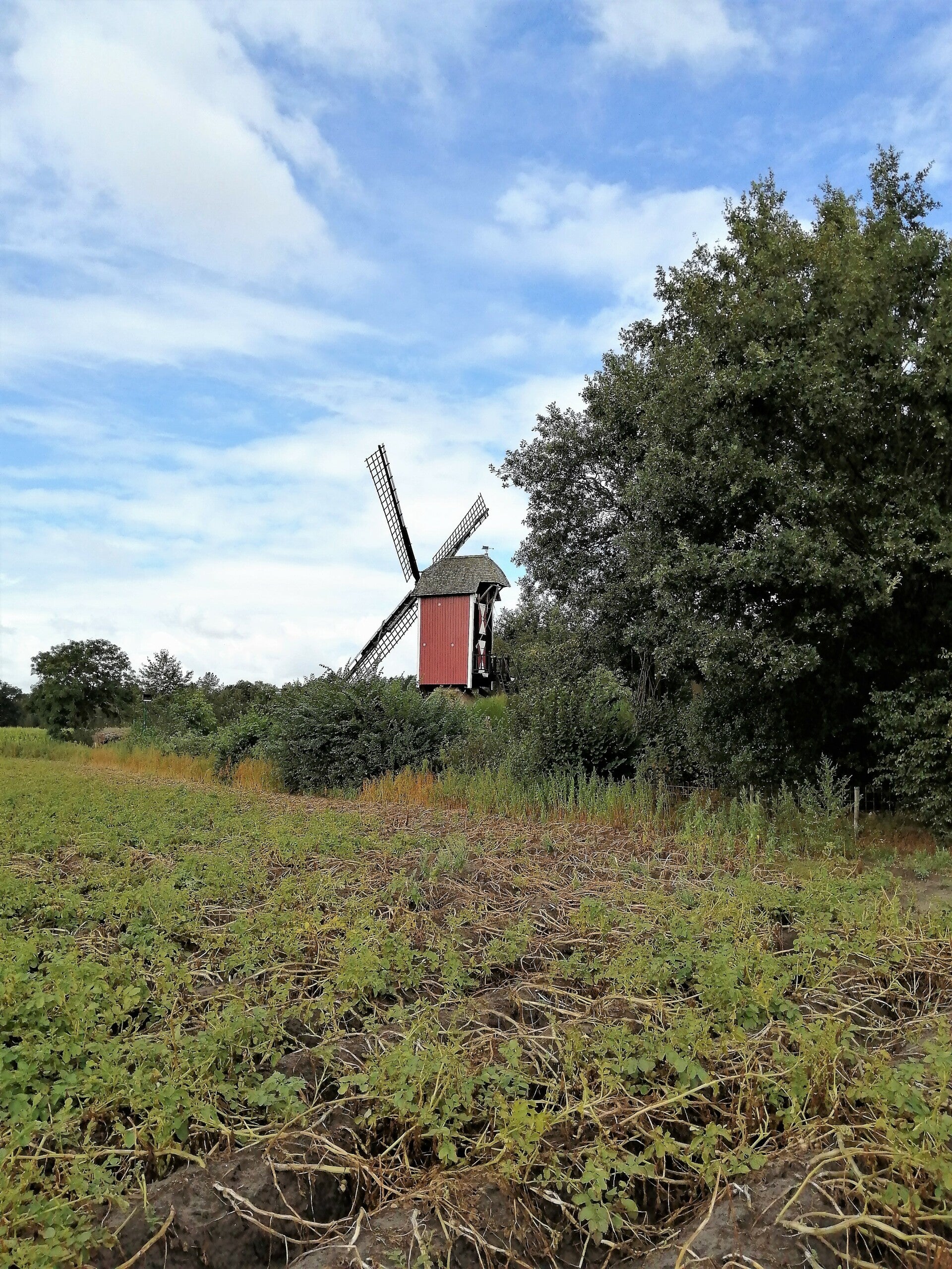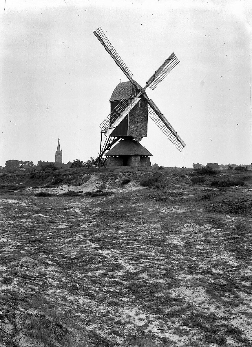 Links achter de molen zie je de toren van de Sint-Petrus’-Bandenkerk in Leende. Door de blaasvormige bol op de toren wordt de toren in de volksmond de “Lindse Blaos” genoemd.