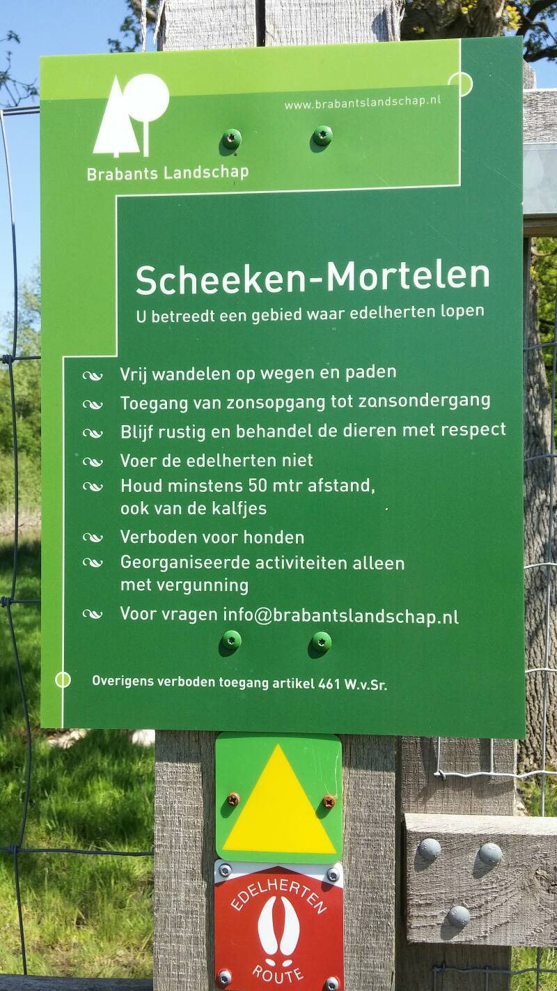 Via een tunnel onder de spoorlijn kom je in het gebied De Scheeken waar begin 2017 edelherten zijn uitgezet, 4 herten en 9 hindes. Er zijn inmiddels kalfjes geboren. Tijdens mijn wandeling heb ik één hinde gezien, een machtig groot dier. Helaas te ver weg om er een goede foto van te kunnen maken, maar wel goed kunnen bekijken met de verrekijker.
