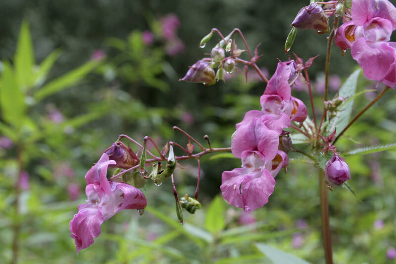 Verderop naast het pad groeit hoog onkruid en een van die planten draagt de mooie naam “Canadese Fijnstraal”. Er staat ook “Reuzenbalsemien” (men noemt deze ook wel “Springbalsemien”). Als je op de rijpe zaaddozen knijpt dan springen deze open. Het is een echte woekerplant die zijn oorsprong vindt in de Himalaya.