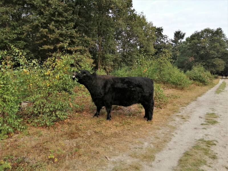 Verderop buigt het pad weg van de beek en via allerlei brede en smalle bospaden ga je over een vee rooster een gebied in waar je Gallowayrunderen kunt tegenkomen.