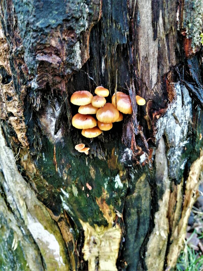 Op diverse plaatsen groeien fraaie paddenstoelen op overgebleven stammen van gekapte bomen.