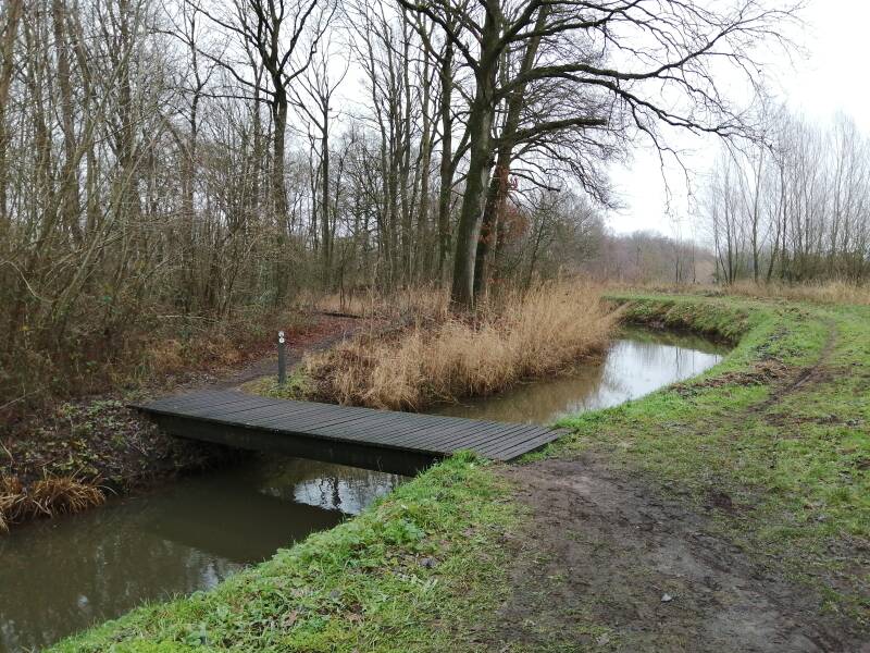 Vóór deze brug gaat de route links over een graspad naast de beek. Het pad draait verderop weg van de beek (zie de routebeschrijving onder punt 1.)
