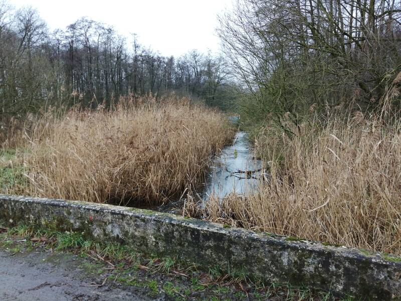 Aan een zijde van de brug is de beek nog te zien, terwijl aan de andere zijde het zicht op het water ontbreekt.