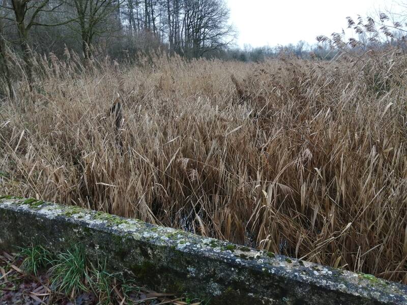 Over een veldweg langs een geasfalteerd fietspad kom je bij een brug over de Leukerbeek. Wat erg opvalt is dat het riet hier welig tiert.