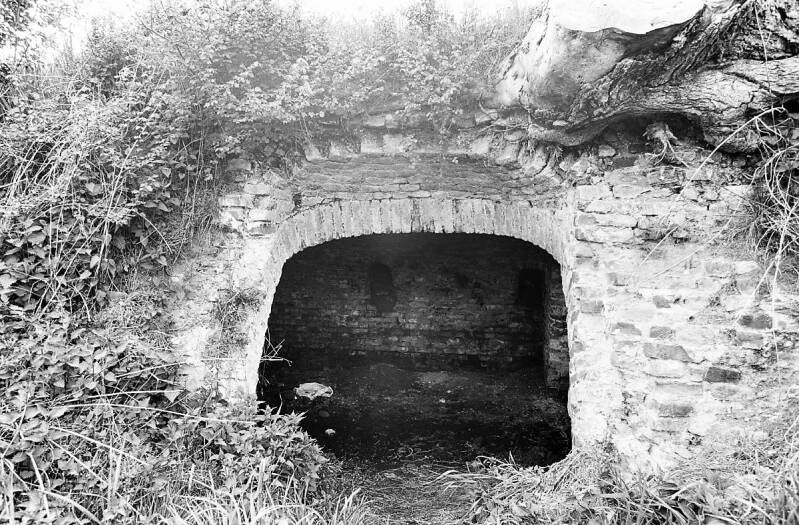 Op de foto rechtsonder de nog bestaande ijskelder in de dijk langs de Maas.
