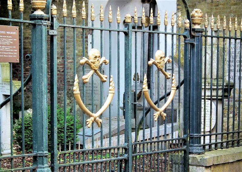 Hier liggen, achter het hek met doodshoofden, zeven personen begraven, waaronder een baron met zijn twee echtgenotes en een graaf met zijn echtgenote.