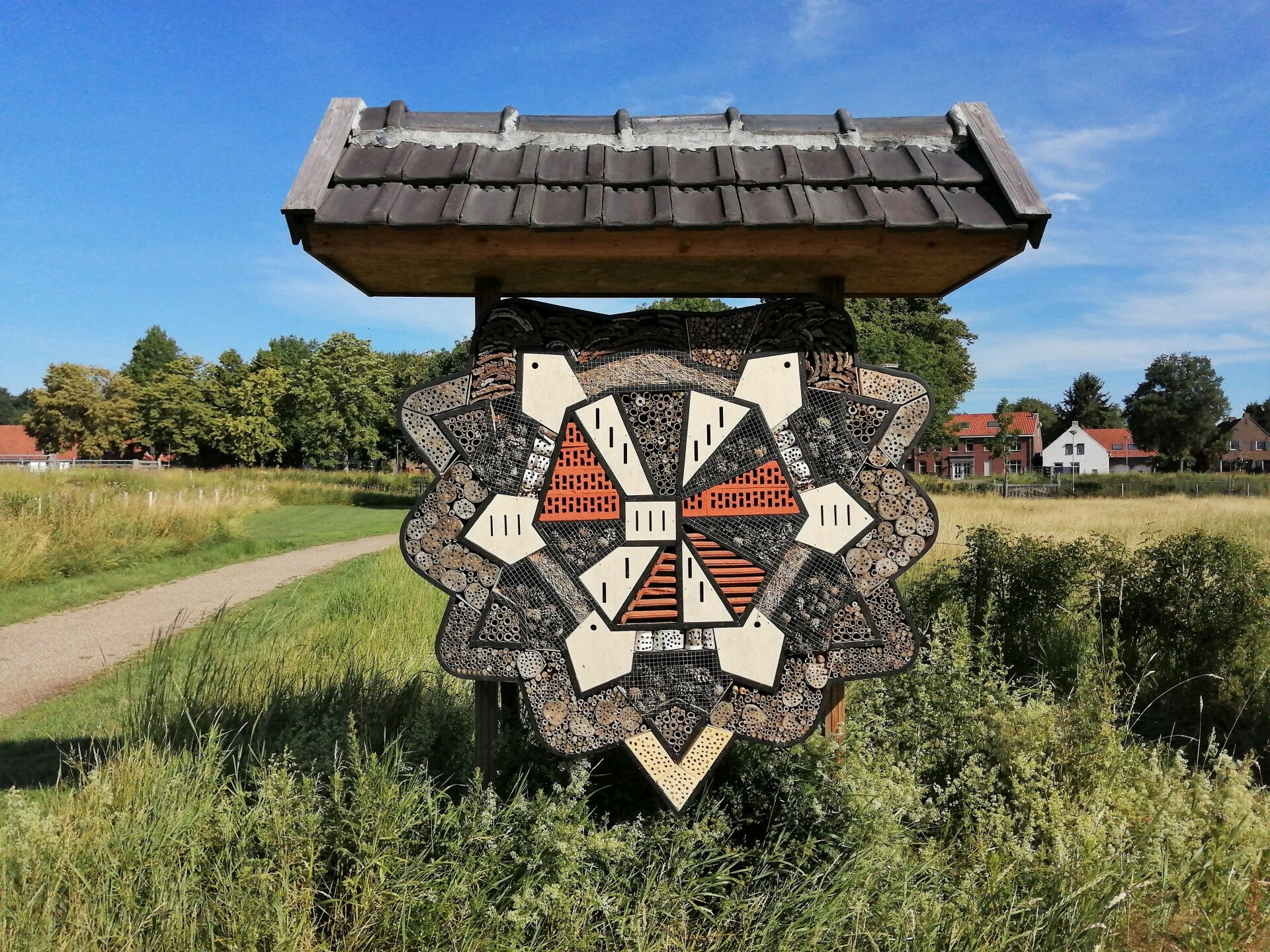 In de routebeschrijving bij punt 2 volg je voorbij een parkeerterrein en na het passeren van een kapel een grindpad waarlangs een insectenhotel staat.