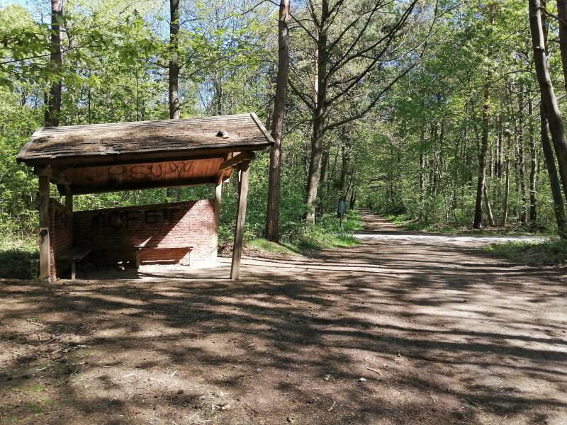 Na de bospaadjes gaat de route over bredere paden door een bosgebied waarbij je voorbij een schuilhut loopt. Gelukkig hoefde ik daarvan geen gebruik te maken met dit mooie zonnige weer.