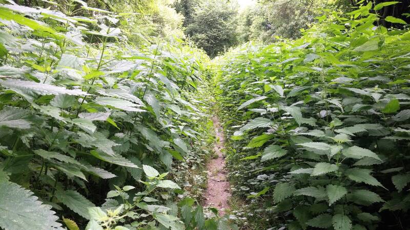 De wandeling loopt soms over bijna overwoekerde paadjes en langs hoge brandnetels. Dat is niet altijd prettig, vooral met nat weer, maar is wel een beetje avontuurlijk. Zoals al bij een andere wandeling is opgemerkt blijft het noodzakelijk om na de wandeling goed te controleren op teken. Zeker als je over dergelijke paadjes hebt gelopen. Maar met bedekte benen en armen loop je minder risico. Ik zal het wandelen er niet voor laten!