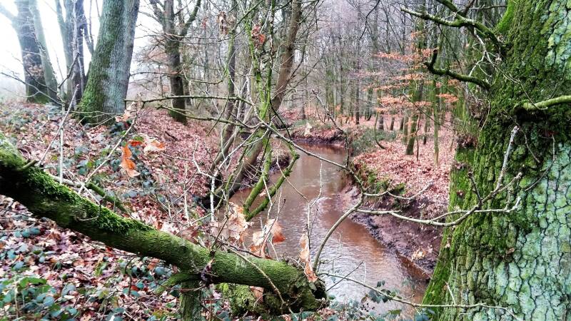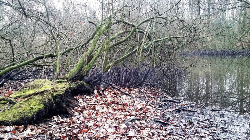 Aan de overkant van de beek duidelijke knaagsporen van de bever