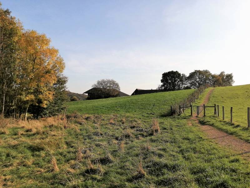 Direkt na het stegelke loopt het pad omhoog in het heuvelachtige landschap