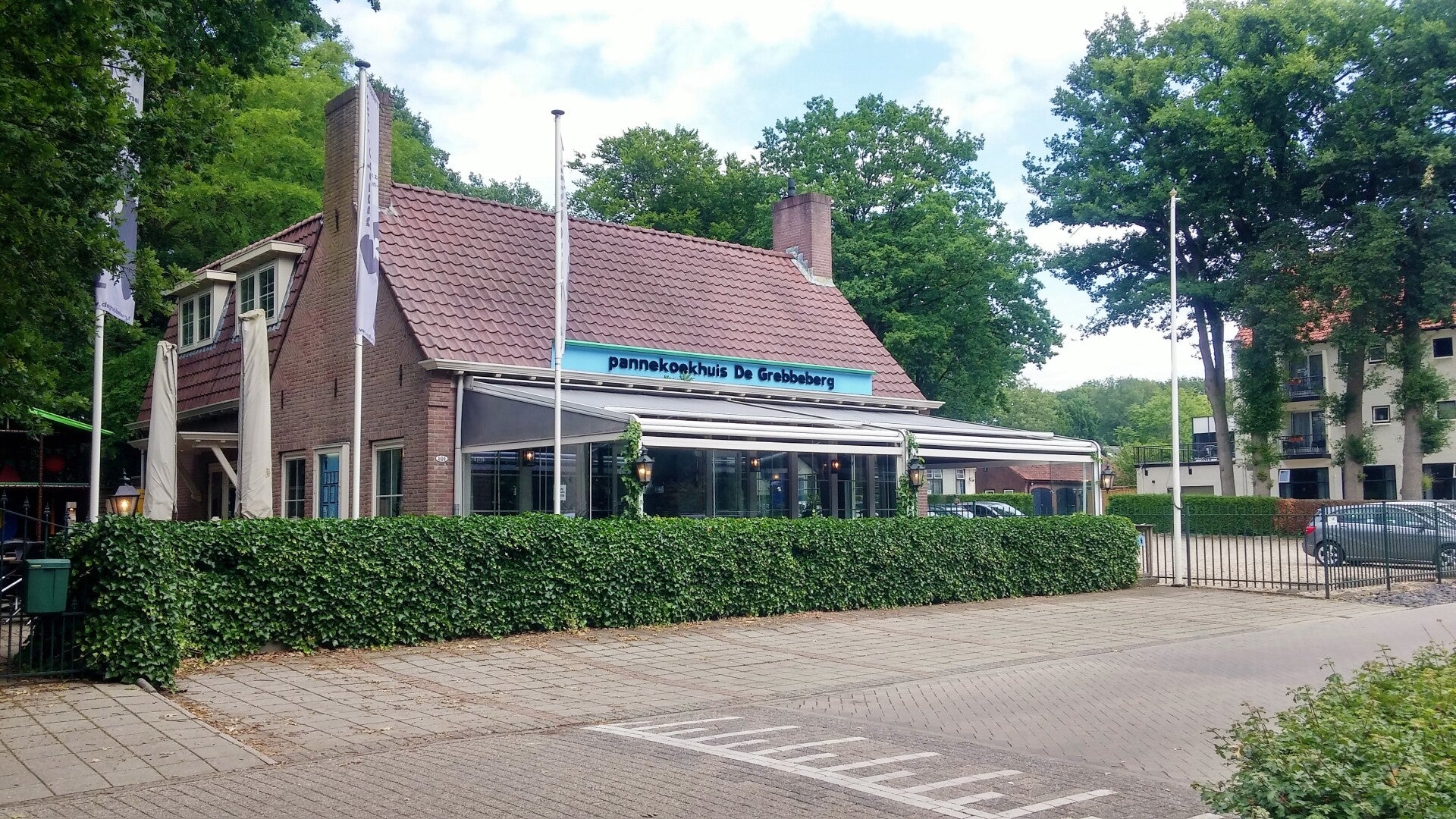 Na een mooi gedeelte door het bos van de Grebbeberg kom je bij een verkeersweg met aan de overkant een pannenkoekhuis waarna je linksaf gaat langs deze weg.